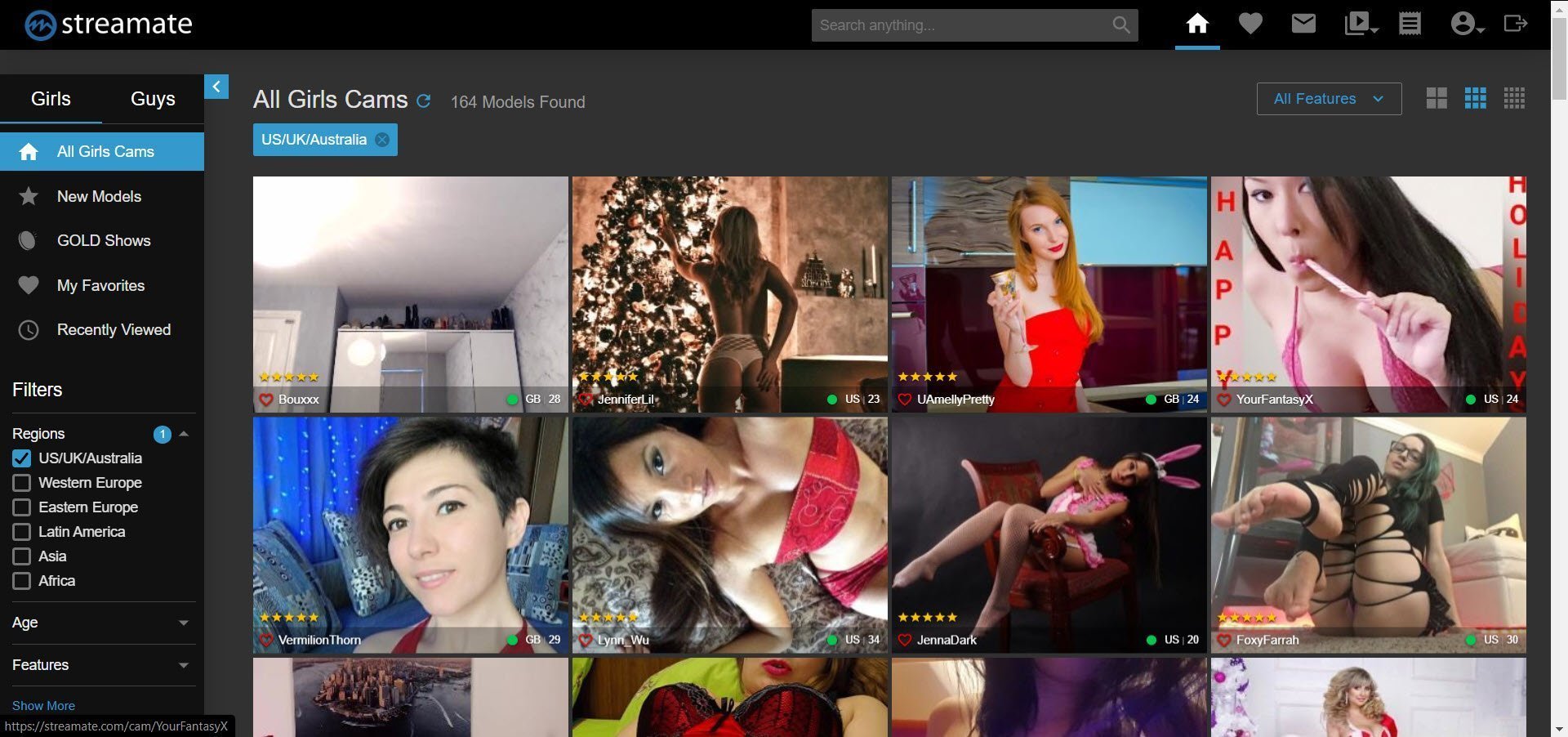 To find American cammodels on Streamate, choose the first option: “North America.” in the left sidebar. Once it is selected, the website brings the list of all American & Canadian cammodels. Note that this list can be short or long depending on the time of the day. I should say that the most interesting American cammodels are online between 5:00 PM and 11:59 PM (12:00 and 23:00 (24h)) Eastern standard time. (GMT -4).