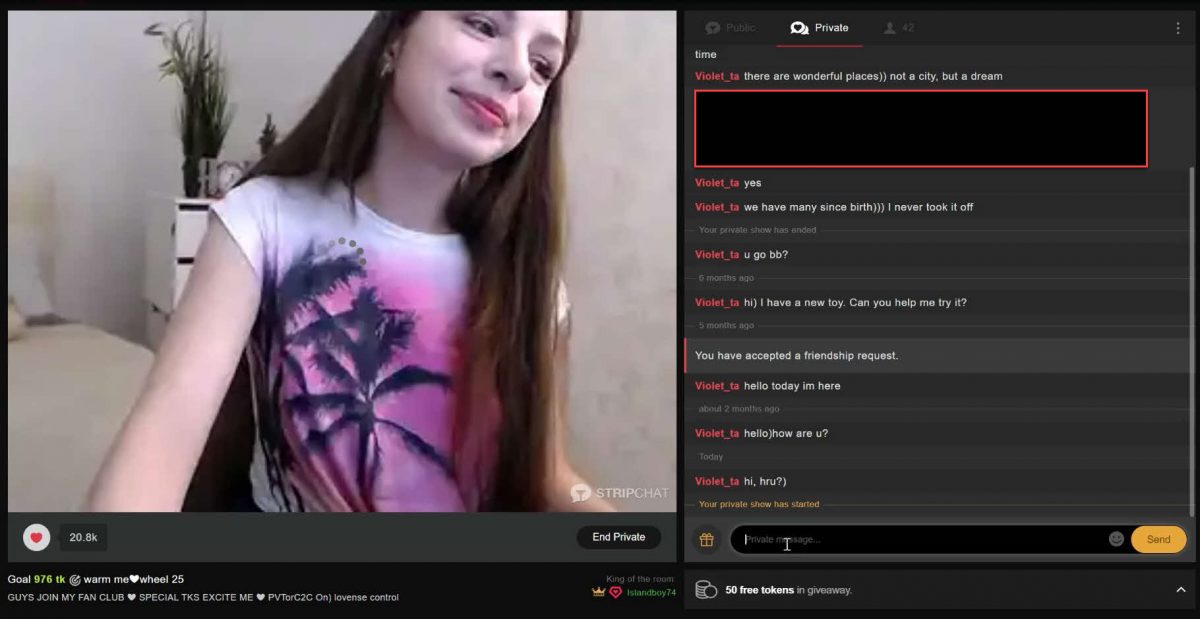 After buying stripchat tokens, you are ready to enter a private chat room of a cammodel. To do so, click on the “start Private” button located at the bottom of the cammodel’s screen (see our 1st screenshot).